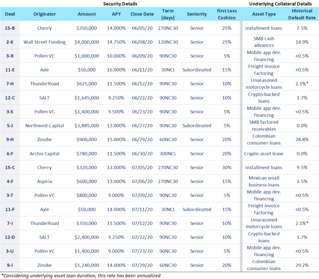 In the month of July, we continued to focus most of our attention on analyzing and monitoring underlying asset performance for all our borrower partners. We are now publishing periodic surveillance reports on eight borrowers on the Percent platform and expect to have a few more available by the end of August. You can find more information on how to best navigate these reports in one of our latest insights articles titled Delivering on Transparency with our Latest Surveillance Reports.