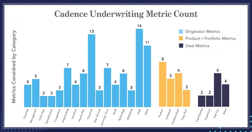 Our Chart of the Week below shows the metrics Percent considers when choosing to onboard prospective borrower partners. Even after a borrower has gone through a rigorous diligence process with respect to corporate-level factors, dozens more portfolio and deal factors are assessed. In all, 130 metrics are incorporated into our underwriting procedures.