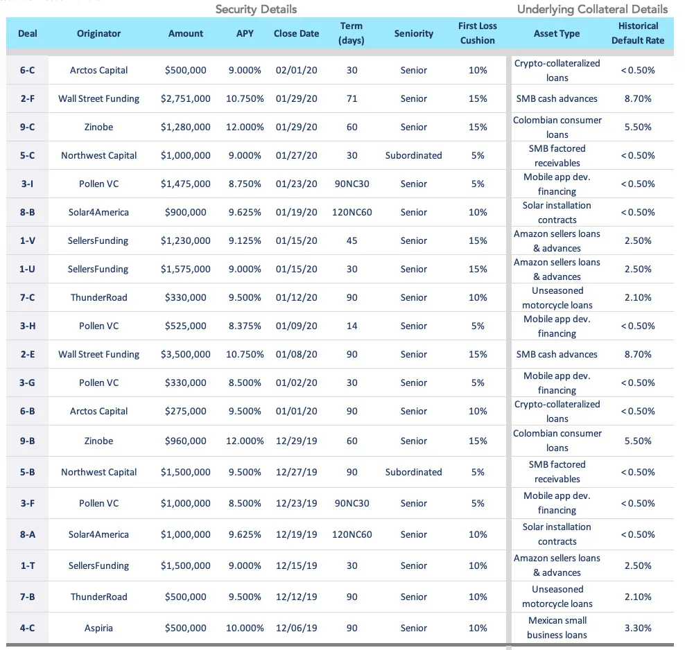 - After 2019 full year final issuance came in at $43.5mm, this month's deals bring our since inception volume to stand at $58.7mm, spanning 53 individual structured note offerings from 9 active originators.