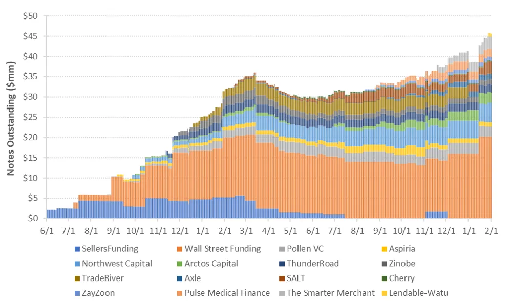 The STNP market (including both retail and prime issuances) continued to expand during the month of January. As of February 1st, a total of $45.6 million of notes were outstanding following $22.8 million of issuance. The volume outstanding during the last week of January set a new record high for the STNP Percent platform.