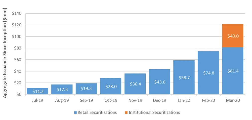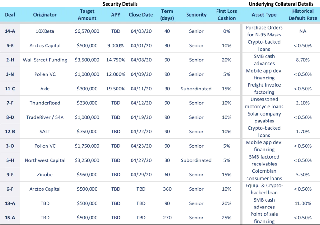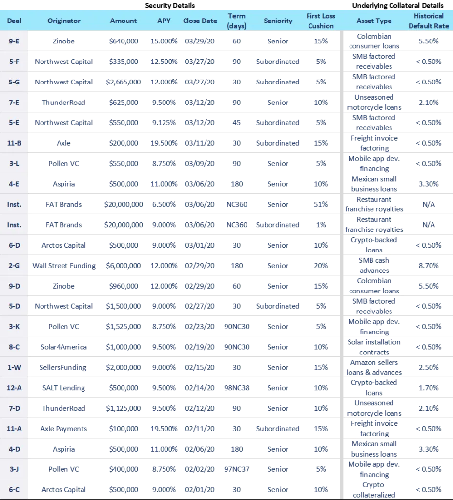 In the month of March, we formally closed on our first institutional securitization, a $40mm offering for FAT Brands (NAS: FAT), upsized from the initial target of $30mm. Percent acted as the sole structuring consultant and arranger. Our experience with digital assets also proved to be crucial, as FAT’s Series 2020-1, rated by DBRS Morningstar, marked the first time a public rating has been assigned in connection with a digitized asset-backed security. See our press release and Forbes article highlighting the offering and its unique qualities. Additionally, we successfully priced 9 offerings across our STNPs to land at $6.6mm, bringing our YTD 2020 total to $37.8mm.
