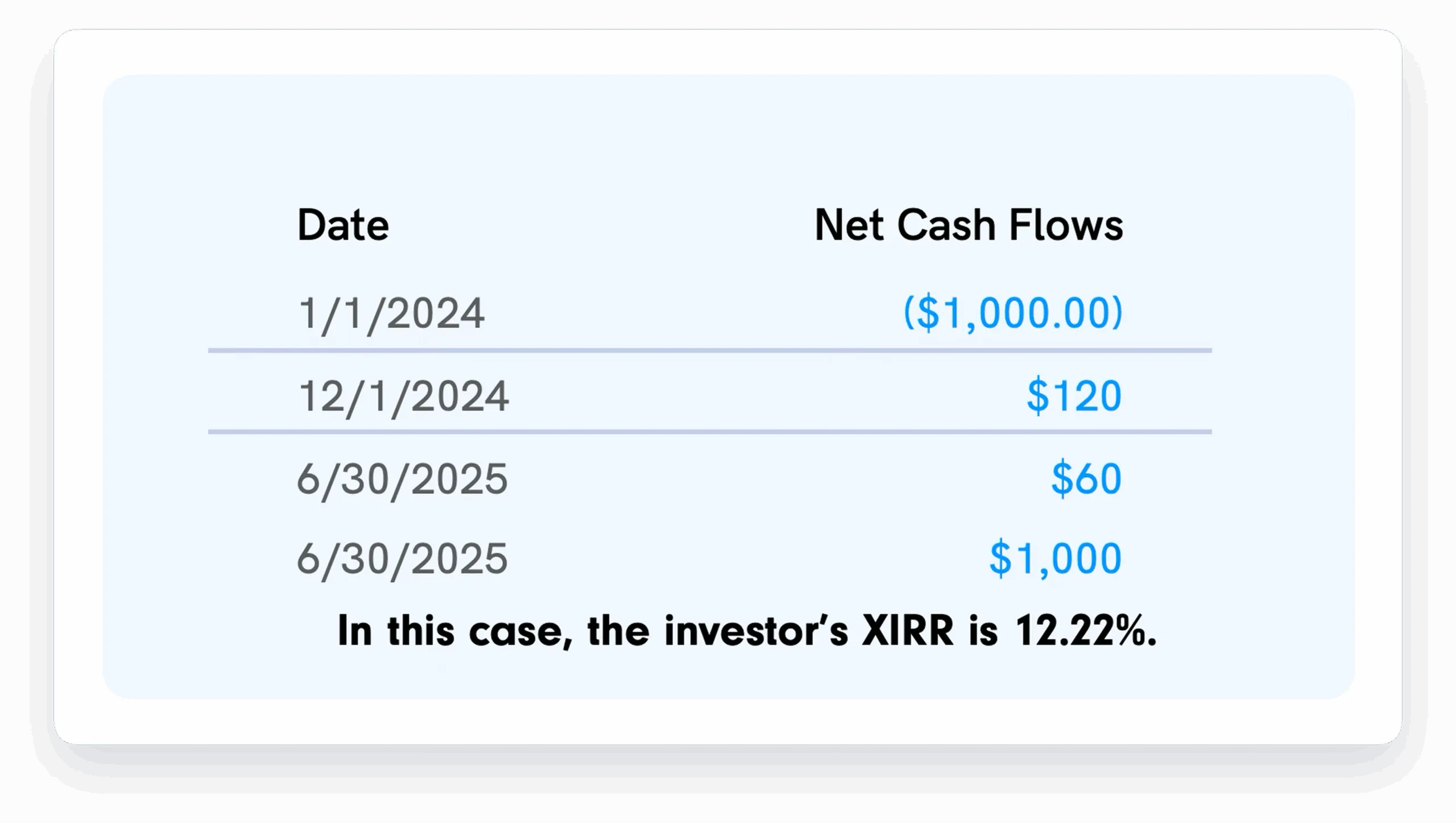 To calculate this yourself, you can enter the dates and cash flows into the XIRR formula in Excel or a financial calculator.