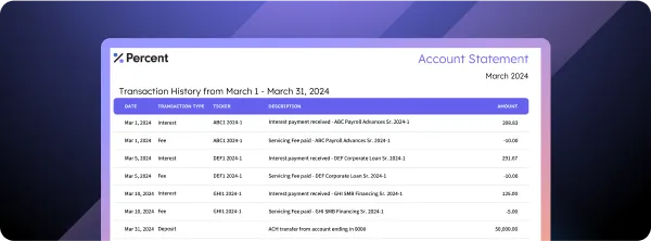 We’re thrilled to introduce newly redesigned monthly statements that make understanding your Percent investments even easier. These upgrades provide greater clarity, a more focused overview, and faster delivery. It’s part of our ongoing commitment to empower you with the information that you need to manage your private credit portfolio with confidence.