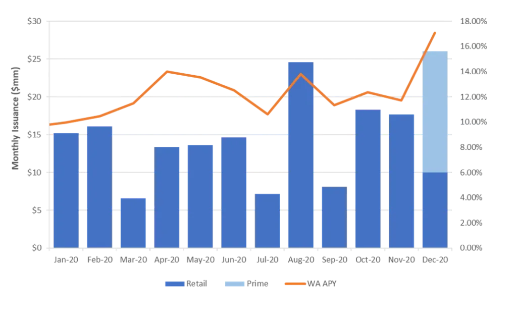 - STNPs issued in December had a weighted average APY of ~17.1%, with average tenors hovering a little below the 543 days mark, heavily weighted by the $16 million prime transaction for Wall Street Funding. This compares to a new issue weighted average APY for November of ~11.7%.