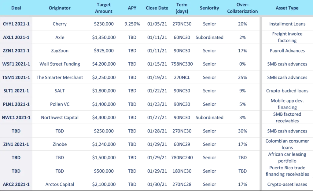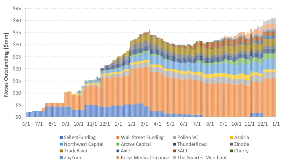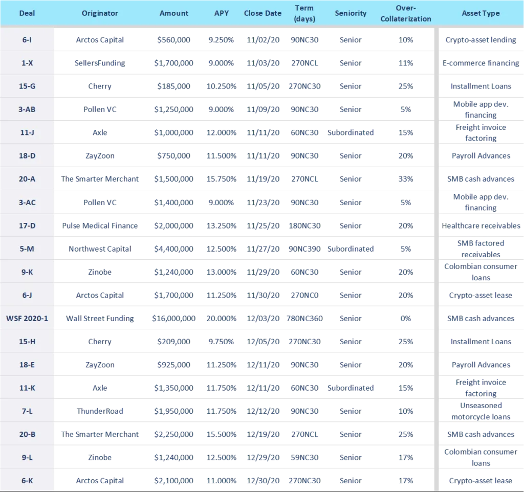 - Offerings ranged widely in terms of tenor and size, from a 3-month senior issuance of $925,000 with ZayZoon pricing at 11.25% to a $209,000 senior 9-month note with Cherry pricing at 9.75%.