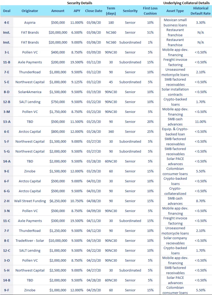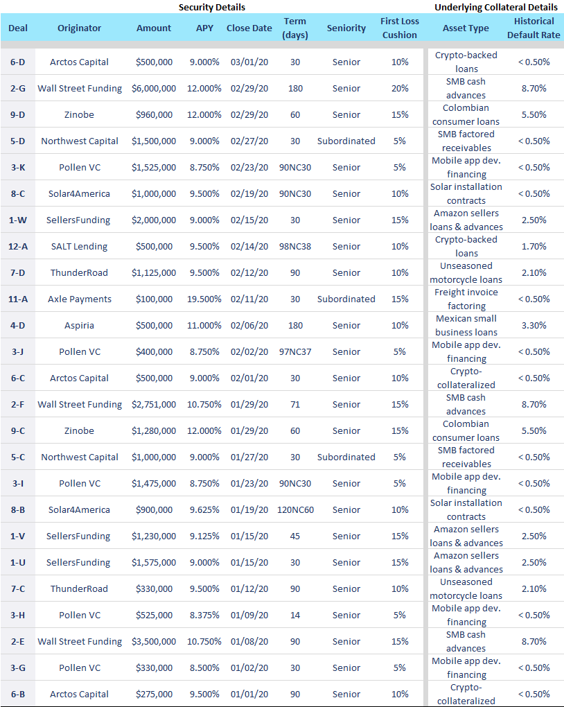- Offerings ranged widely in terms of price and size, from an upsized $6mm 6 month note with Wall Street Funding pricing at 12.000%, to an inaugural 1-month $100k subordinated note with Axle pricing at 19.500%.