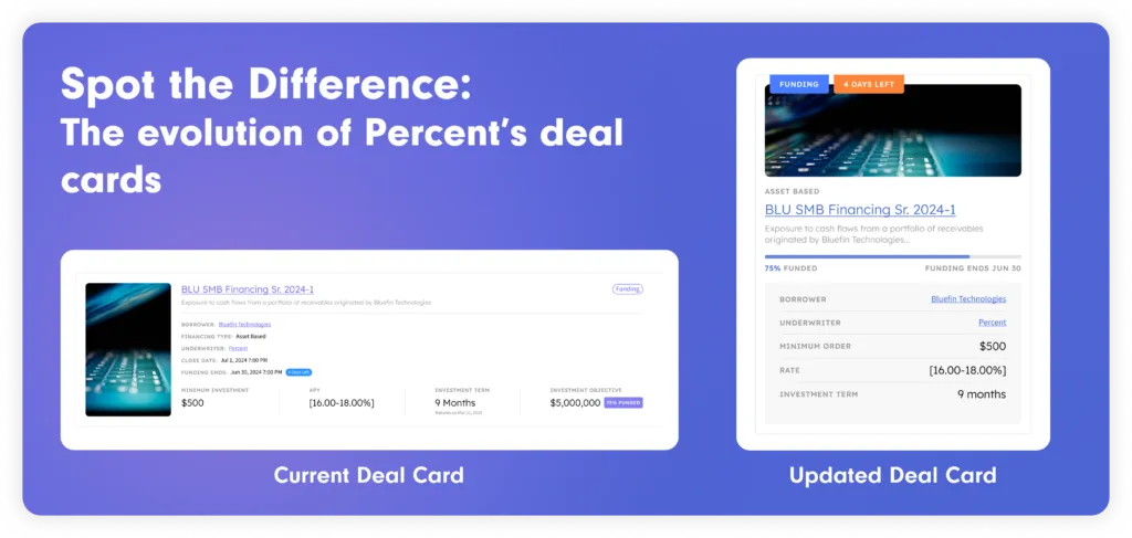 We're confident that these enhancements will improve your Percent experience. Stay tuned for the launch of the new deals page and discover how easy it is to diversify your portfolio with private credit investments.