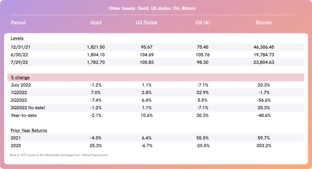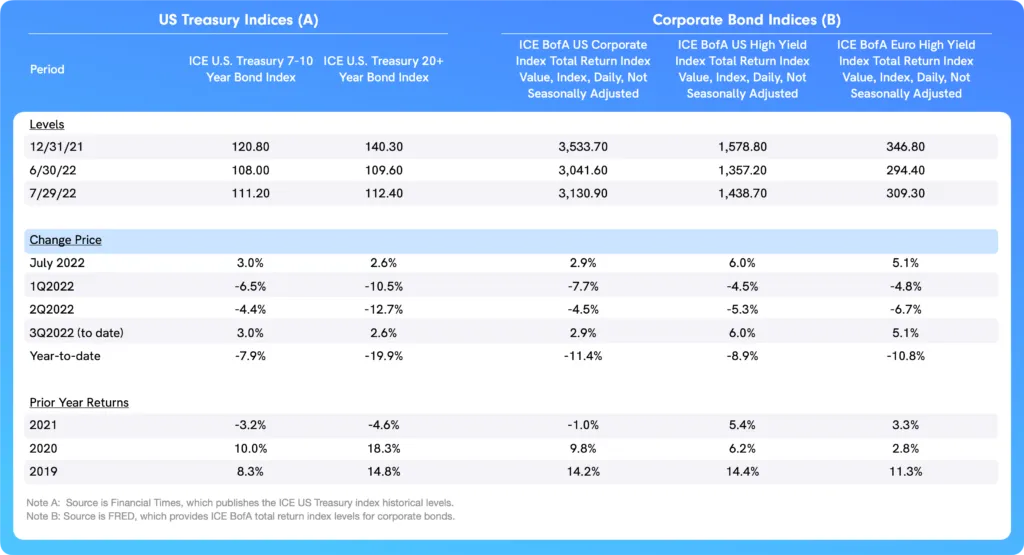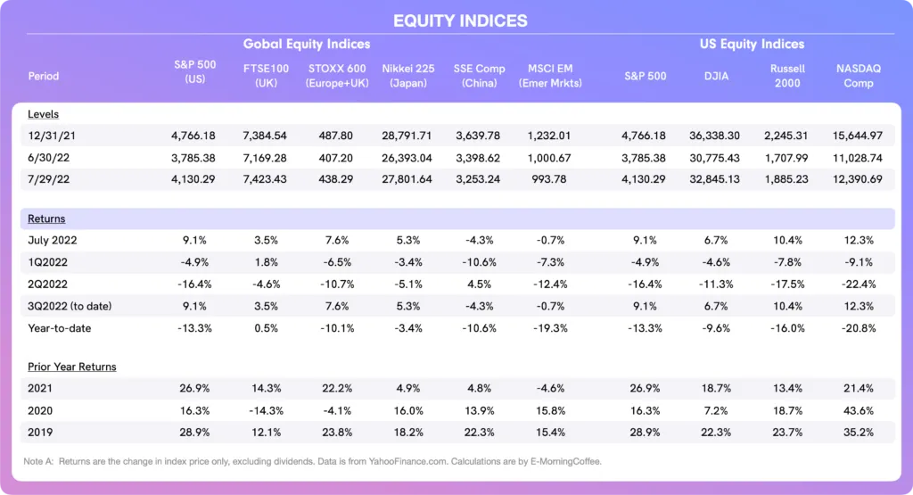 Equities: All four of the U.S. equity indices we track were positive in July, a welcome break from sharply negative returns in June and in the first half of 2022.