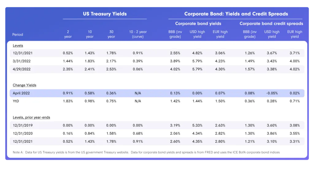 U.S. Treasury yields rose sharply during April across the curve, with the benchmark 10-year UST yielding 2.89% (+57bps) at the end of April. For months, the yield on the 2-year UST – which increased to 2.70% at the end of April – signaled to the Federal Reserve that it needs to tighten monetary policy to address inflationary pressures.
