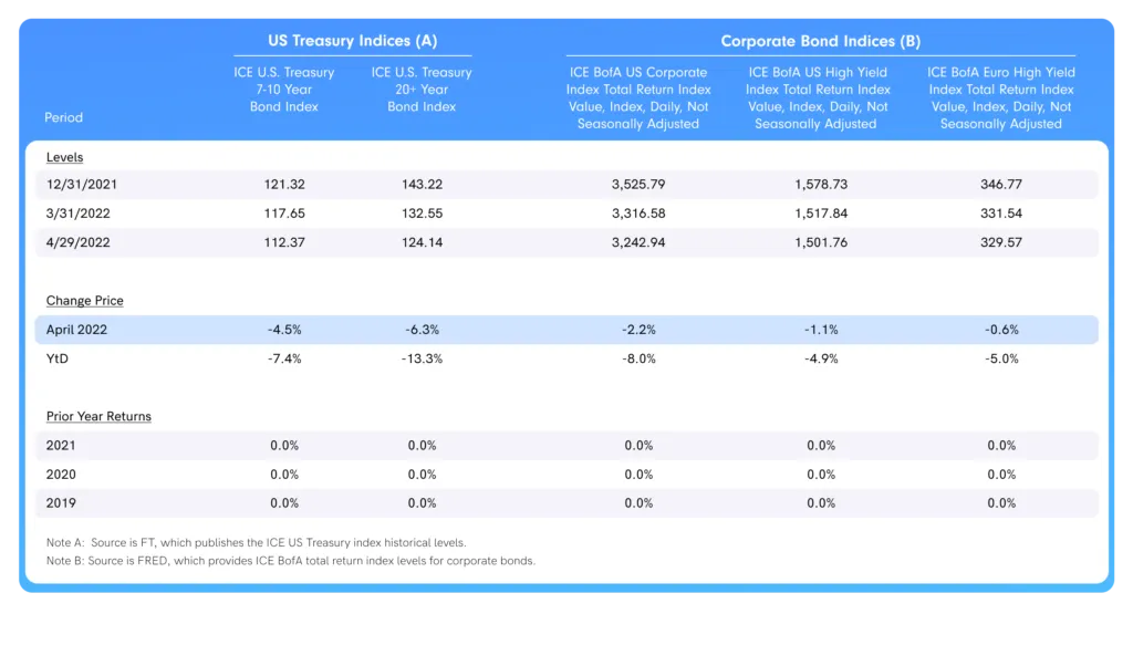 Returns: Given that yields are under pressure, returns in U.S. Treasuries and corporate bonds were poor in April, continuing the trend since the start of the year. As seen in the table below, longer duration bonds (like the U.S. Treasury Bond 20+ Year Index) suffered the most as yields rose.