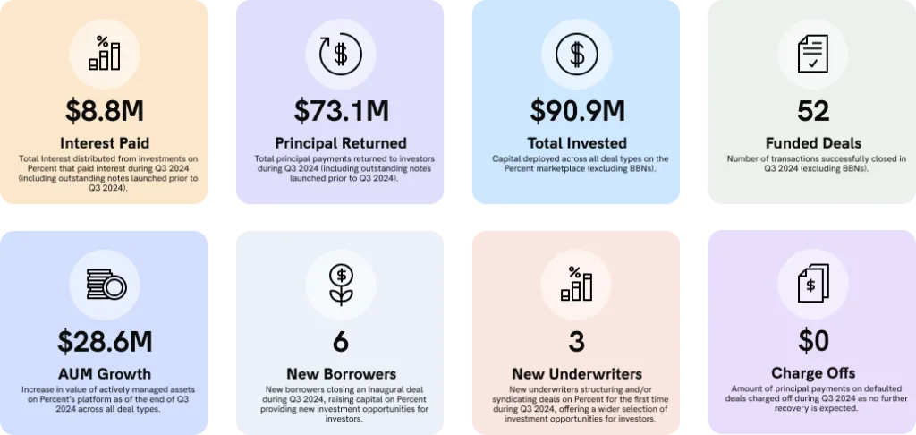 We are pleased to report that following a strong first half of 2024, Percent maintained its momentum and further solidified its position in the private credit space during Q3. This quarter saw continued growth across key metrics, with the addition of new underwriters, borrowers, and investors underscoring our marketplace’s ongoing expansion and increasing sophistication.