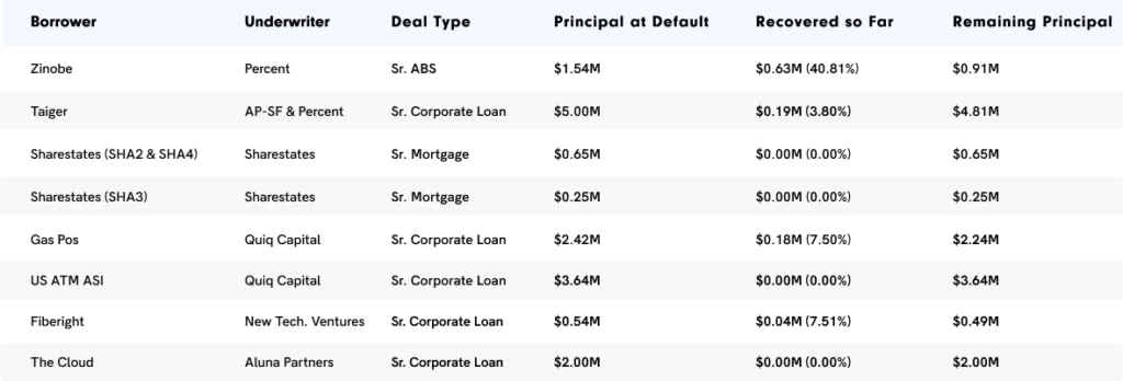 We provide detailed reports and updates on our Current Workouts and Historical Deals Charged-Off and Recoveries pages, ensuring that you have full visibility into our recovery efforts and the performance of our underwriting partners.