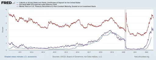The decade of 2010-2020 was characterized by the use of unconventional monetary policy by the Federal Reserve, which resulted in interest rates remaining at record-low levels for much of the decade. As a result, investors – especially retail investors – found it difficult to find debt alternatives that offered any sort of reasonable yield unless they were able to invest for long periods or take on substantially more risk (or do both). Certificate of Deposit (or “CD”) rates remained anchored near zero, and yields on investment-grade rated corporate bond funds were rather meager, too, as you can see in the graph below from the Federal Reserve Economic Data.