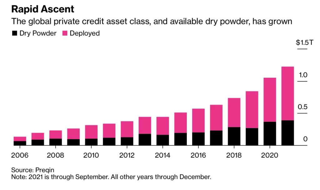 2Source: Preqin. The components in the bar graph labeled “dry powder” refers to the proceeds at debt funds that have not yet been invested or deployed.