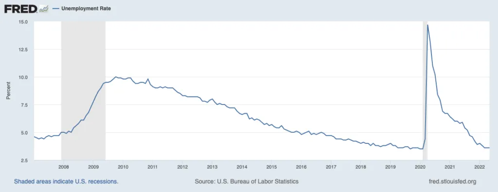- After the initial pandemic recession, unemployment snapped back much more quickly, with U.S. employment now close to the pre-pandemic level (3.6% in May 2022 vs 3.5% in February 2020).