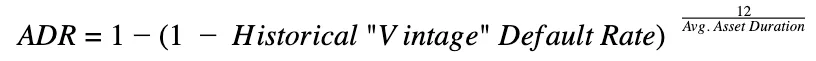 At times, it may be worthwhile to look at defaults on a portfolio of assets over a particular period, instead of on a “per vintage” basis. This might be particularly helpful for comparing assets of varying durations. The idea follows the logic that a 5% default rate on a 12-month loan presents a different amount of credit risk than a 5% default rate on a 3-month loan reinvested 4 times over the same year. Essentially, an Annualized Default Rate measures cumulative defaults per dollar invested in the underlying assets and reinvested over one year. At Percent, we calculate it as follows: